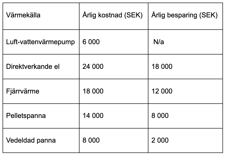 Besparing: Årlig kostnad värmekälla - årlig kostnad luft-vattenvärmepump